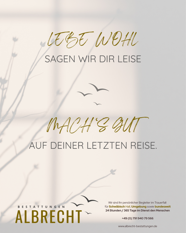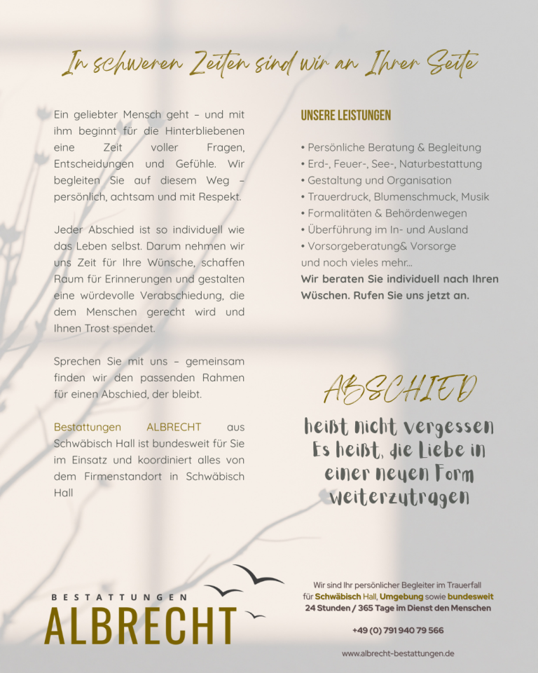 Bestattungen ALBRECHT Schwäbisch Hall steht für eine moderne Form der Bestattung, die Angehörige entlastet, ohne die Würde des Abschieds aus den Augen zu verlieren. Dabei stehen die Verstorbenen und Sie als Angehörige immer im Fokus.
