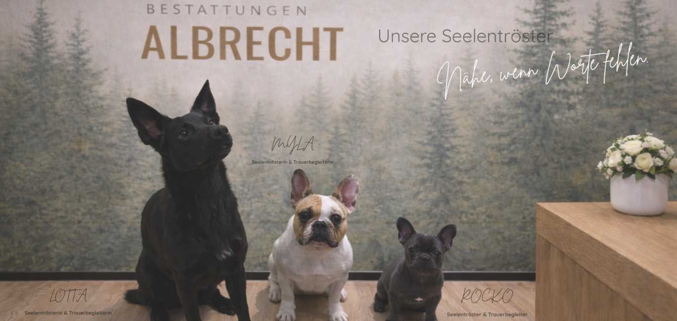 Nachfolgend stellen wir Ihnen unser Team und auch unserer Seelentröster vor. Im Trauerfall stehen wir Ihnen 24 Stunden / 365 Tage zur Verfügung.